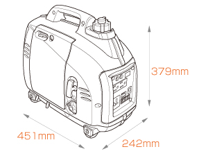 【仕様】 定格出力:900VA(単相100V/9.0A) サイズ:451x242x379mm 乾燥重量:13.0Kg 燃料タンク容量:2.1L エンジン排気量:49.4cm3
