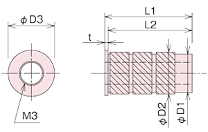 ビットインサートナットM3(フランジ付)【寸法】(mm)D3:6.5D2:5.3D1:5L1:5L2:4.5t:0.5材質:黄銅製6個入り※カーボン脚へのナット埋め込み時にはハンマー等で叩き込まず万力等でゆっくりと圧入し、瞬間接着剤またはエポキシ系接着剤で固定してください。下穴径5.2mm