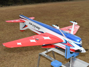 BJ Craft製、胴体コンポジット塗装済み、主尾翼及びカナライザーはバルサリブ組みフィルム貼りARF機を組立〜メカ積みして完成させたが、予備機であったため未飛行状態で保存。メカは降ろしてあったが、中古品を再搭載した。