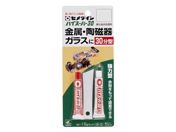 30分で硬化し始めるタイプのエポキシ系接着剤です。 A液(主剤)がピンクに着色してあり、混合の目安として色が消えるため、大変便利です。